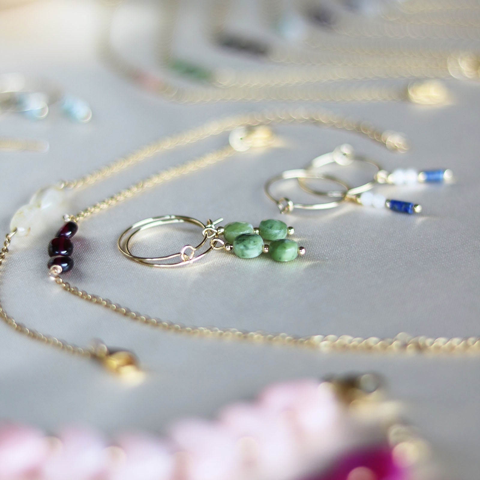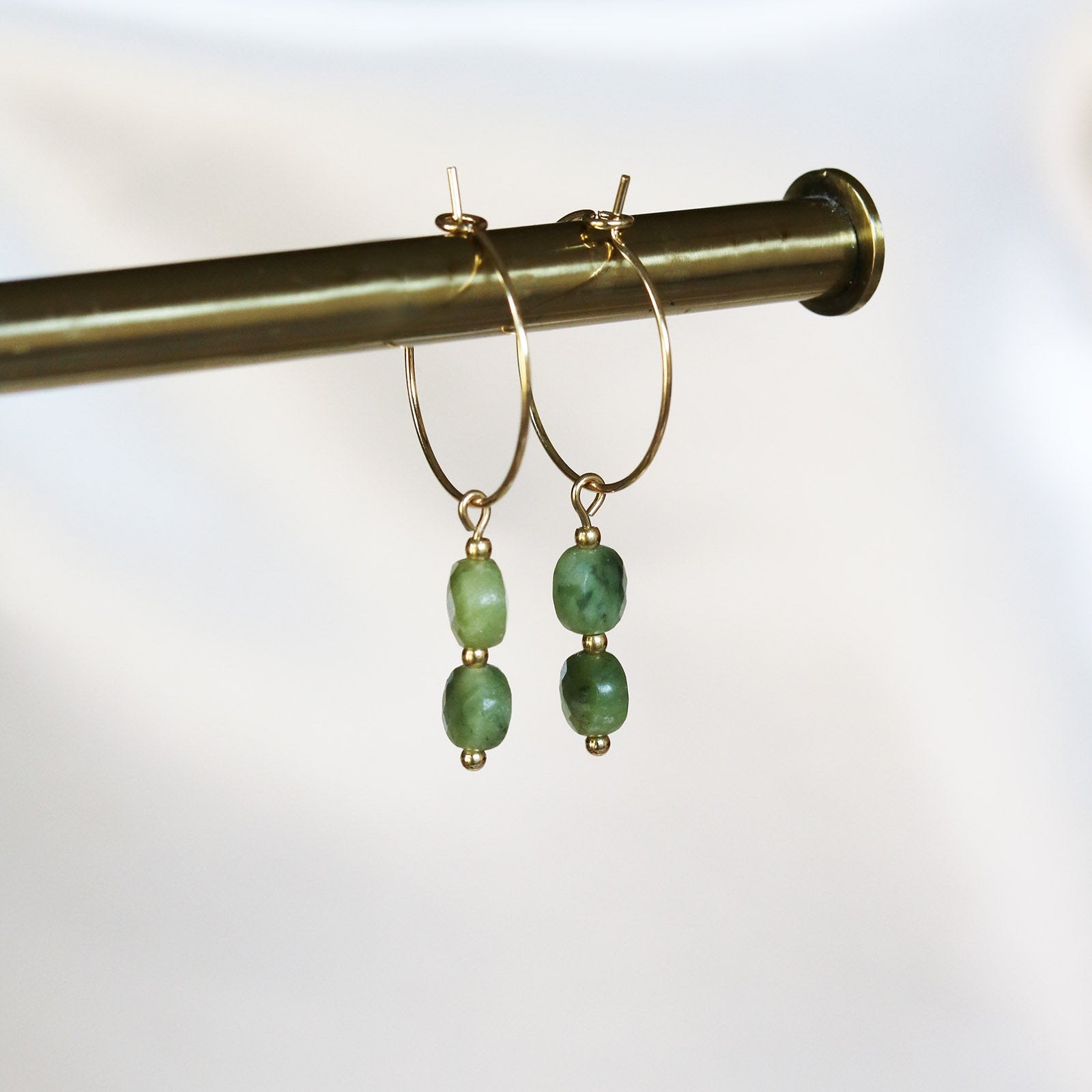 Dunne oorringetjes met subtiele natuursteentjesmateriaal: stainless steelnatuursteen: jadekleur: licht groenmaat: 3,5 cm